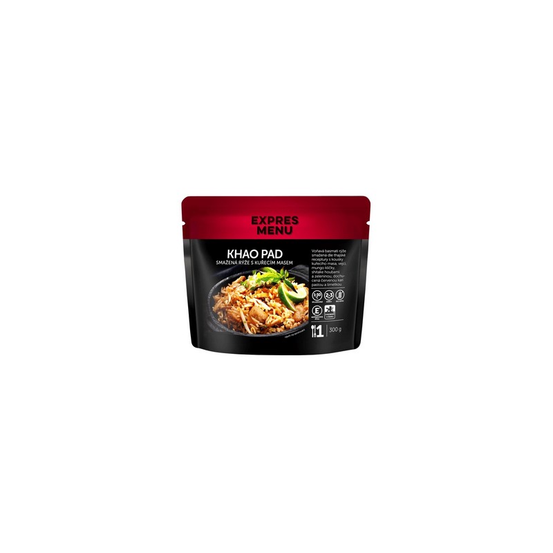 kuřecí stehenní maso (33%), basmati rýže (24%), vaječná melánž (8%), mungo klíčky(7,9%), červená cibule(5,9%), shitake houby(4,7%), olej řepkový, limetková šťáva(2,9%), rybí omáčka(2%) (extrakt ze sardele obecné (63 %), pitná voda, jedlá sůl, cukr), olej sezamový, sójová omáčka(1,8%)(pitná voda, sójové boby, jedlá sůl,ocet kvasný lihový), koriandr listy, červená kari pasta(0,8%) (sušené červené chilli 28 %, citronová tráva, česnek, jedlá sůl, šalotka, kafírové lístky, galgán, koriandr semínko, kmín), česnek(0,8%), cukr třtinový, zázvor mletý, chilli koření drcené.