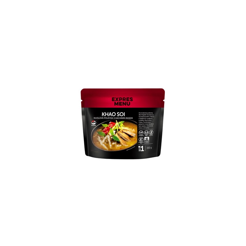 kokosové mléko(20%) (kokos, pitná voda), kachní prsa s kůží (19%), batátové nudle(6,1%)(škrob z batát, pitná voda), limetková šťáva(3,2%),rybí omáčka(2%) (extrakt ze sardele obecné (63 %), pitná voda, jedlá sůl, cukr), kuřecí vývar(kuřecí kosti, pitná voda), třtinový cukr, citronová tráva(1,6%), koriandr listy, červená kari pasta (0,2%)(sušené červené chilli 28 %, citronová tráva, česnek, jedlá sůl, šalotka, kafir, galgán, koriandr, římský kmín), koriandr mletý, římský kmín, chilli, kurkuma, kafírové lístky.